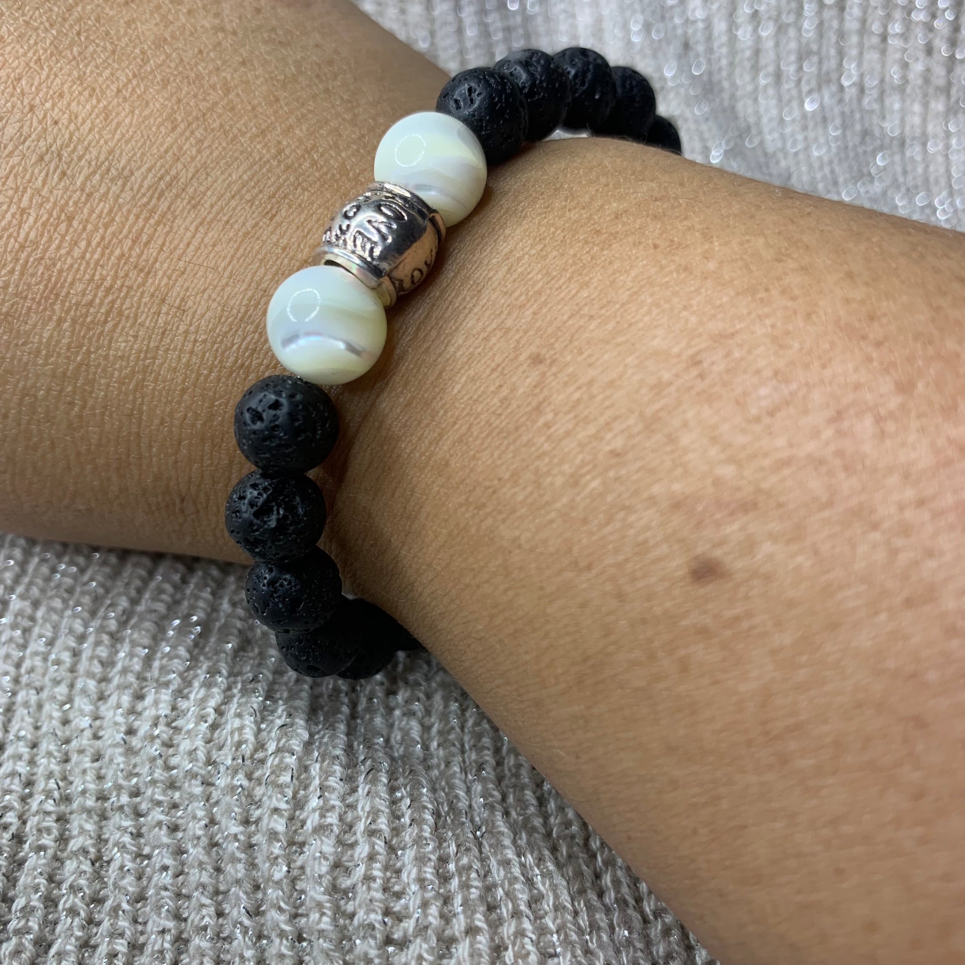 Ce bracelet associe la puissance de la Pierre de lave à la douceur de la Nacre.