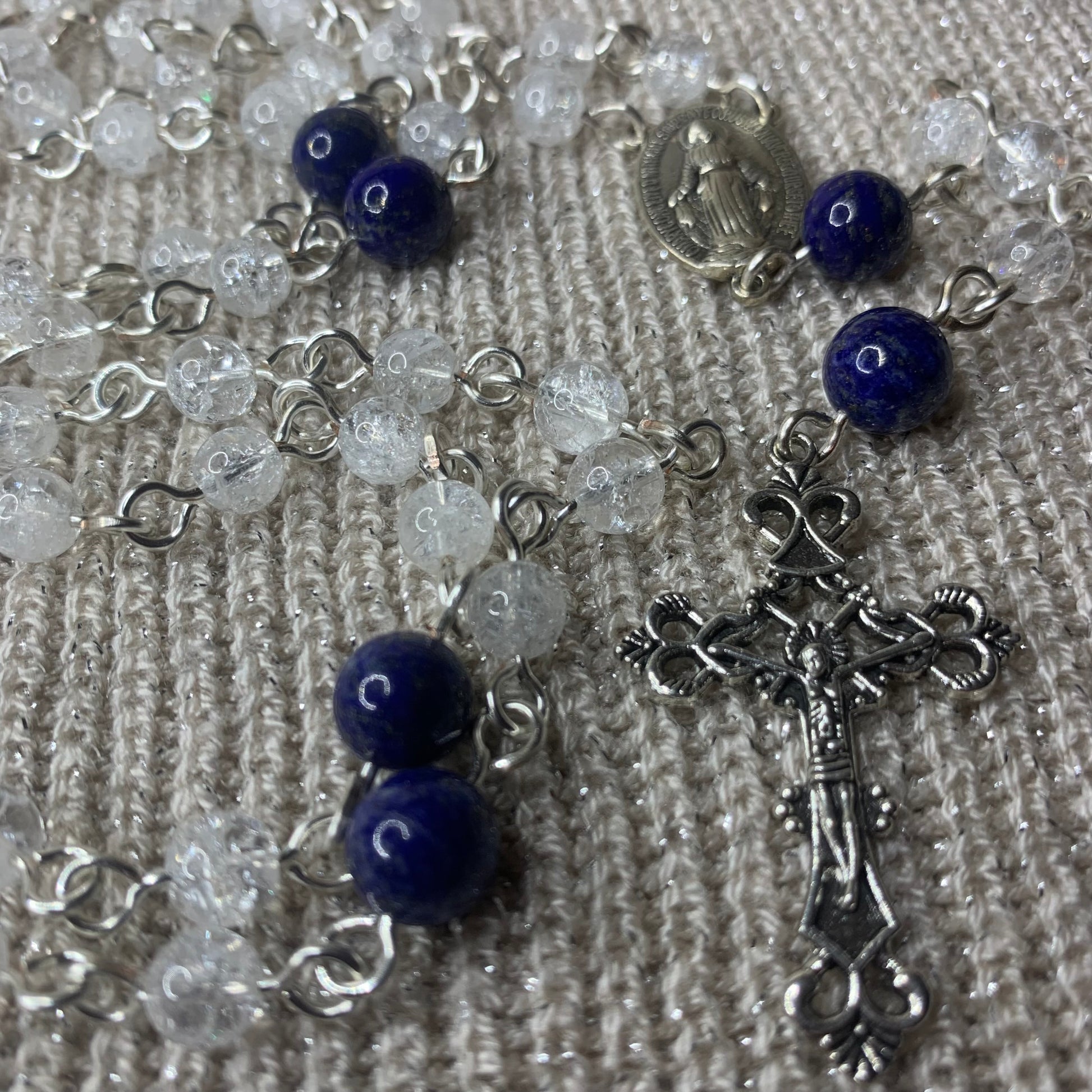 - Chapelet réalisé avec des perles naturelles : Lapis Lazuli 6mm et Cristal de roche 8mm.