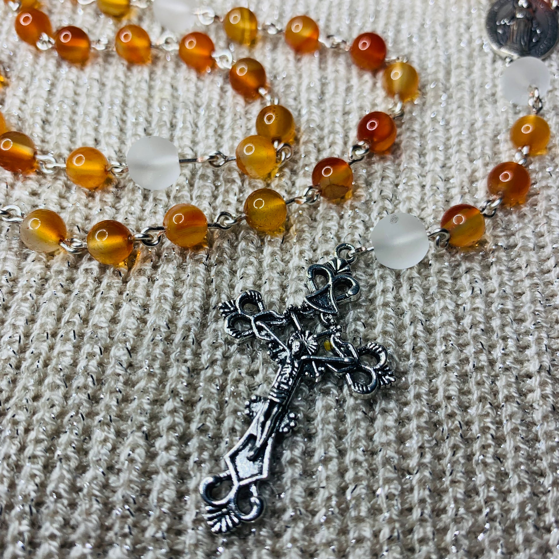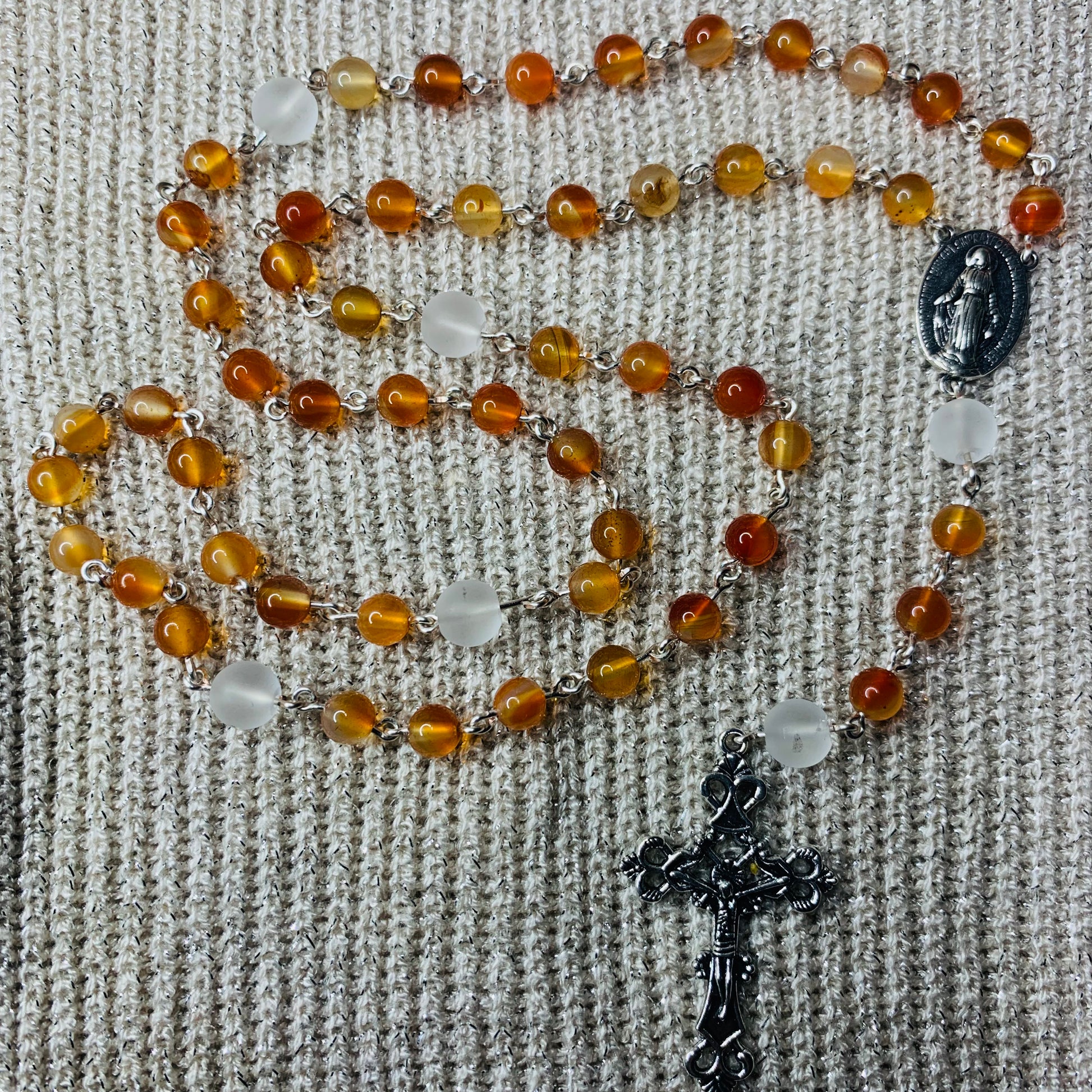 - Chapelet réalisé avec des perles naturelles : Cornaline 6mm et Cristal de roche mat 8mm.