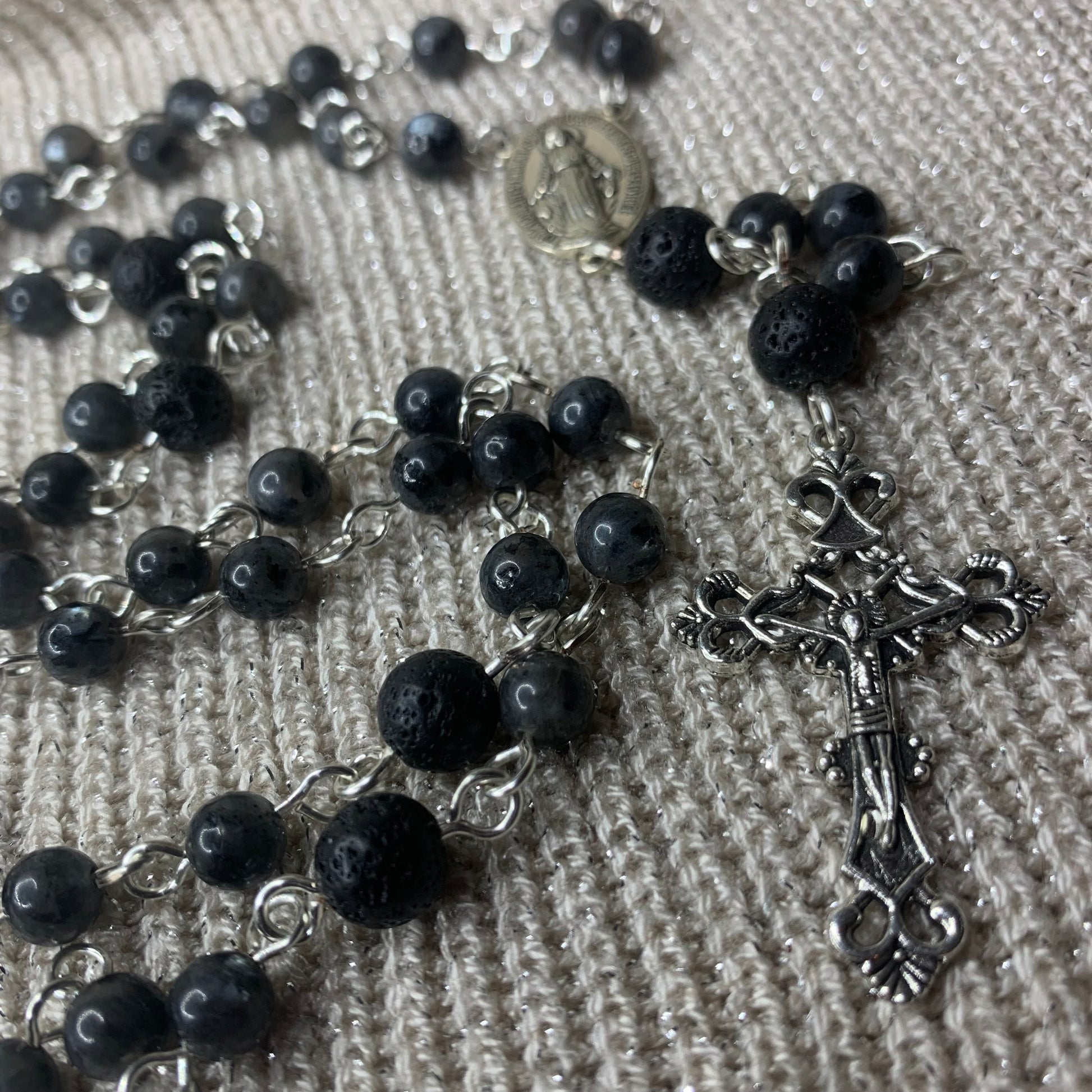 - Chapelet réalisé avec des perles naturelles : Larvikite 6mm et Pierre de lave 8mm.