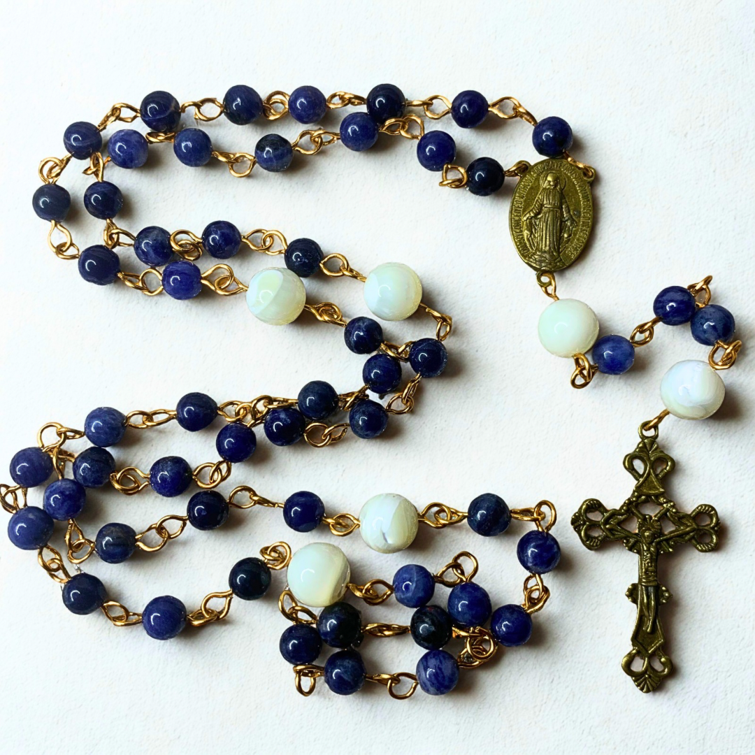 - Chapelet réalisé avec des perles naturelles : Sodalite 6mm et Nacre blanche 10mm.