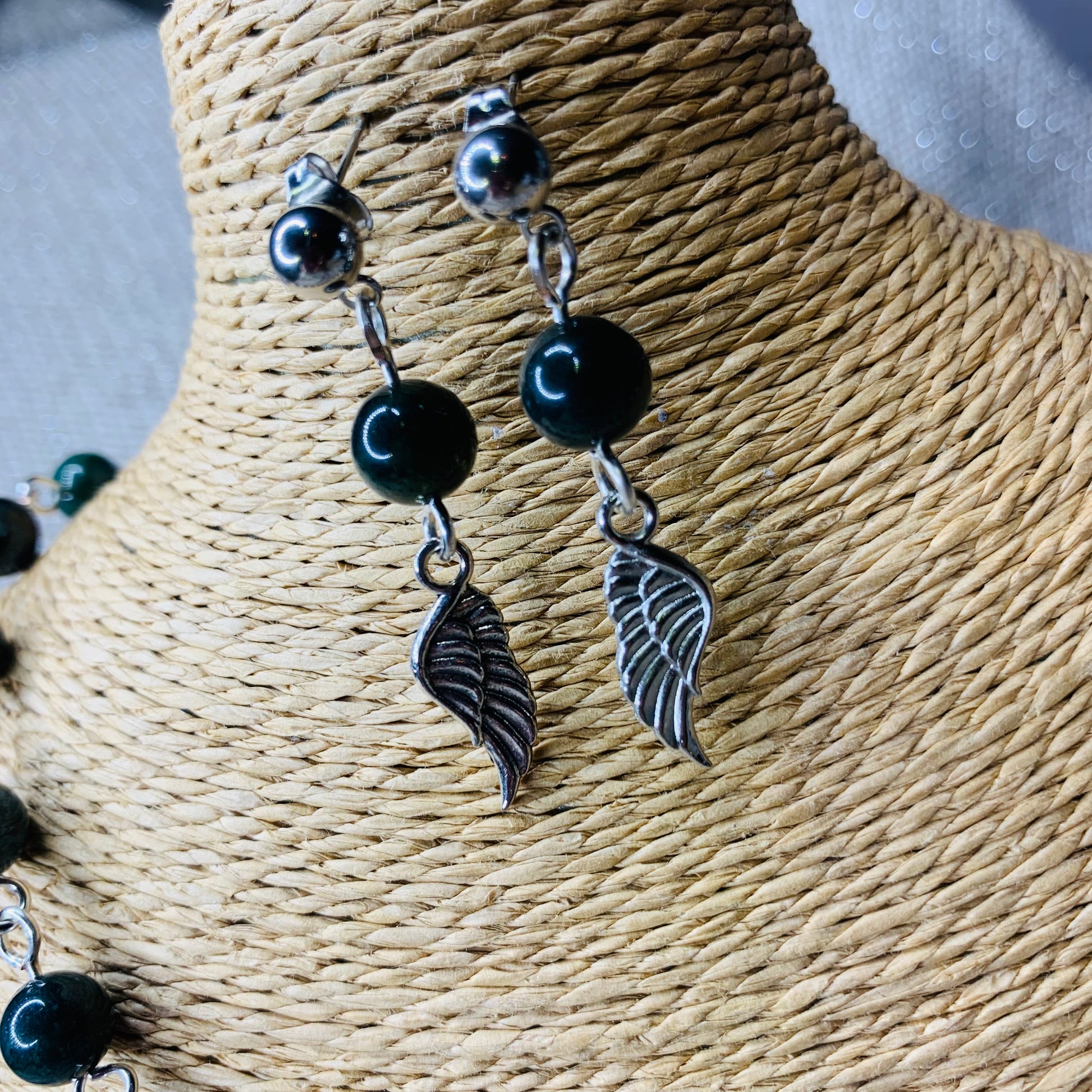 - Collier, bracelet et boucles d’oreilles réalisés avec des perles naturelles : Agate mousse 8mm.